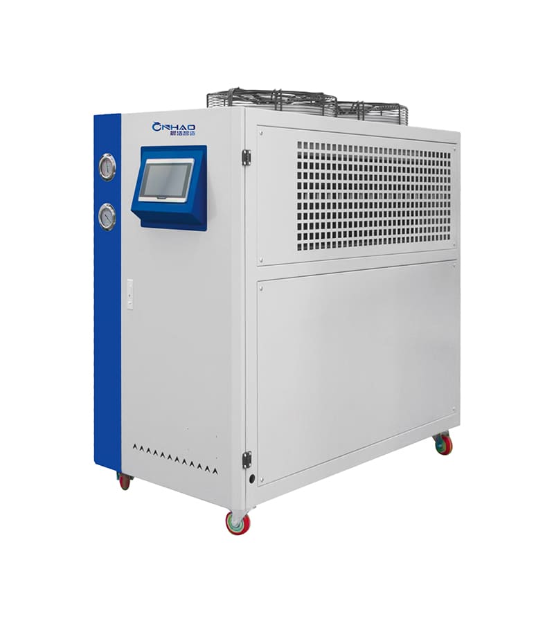 风冷式冷水机​​采用高效翅片式冷凝器,以强制空气对流实现快速导热,散热效率显著提升,​​无需外接冷却水系统​​。
